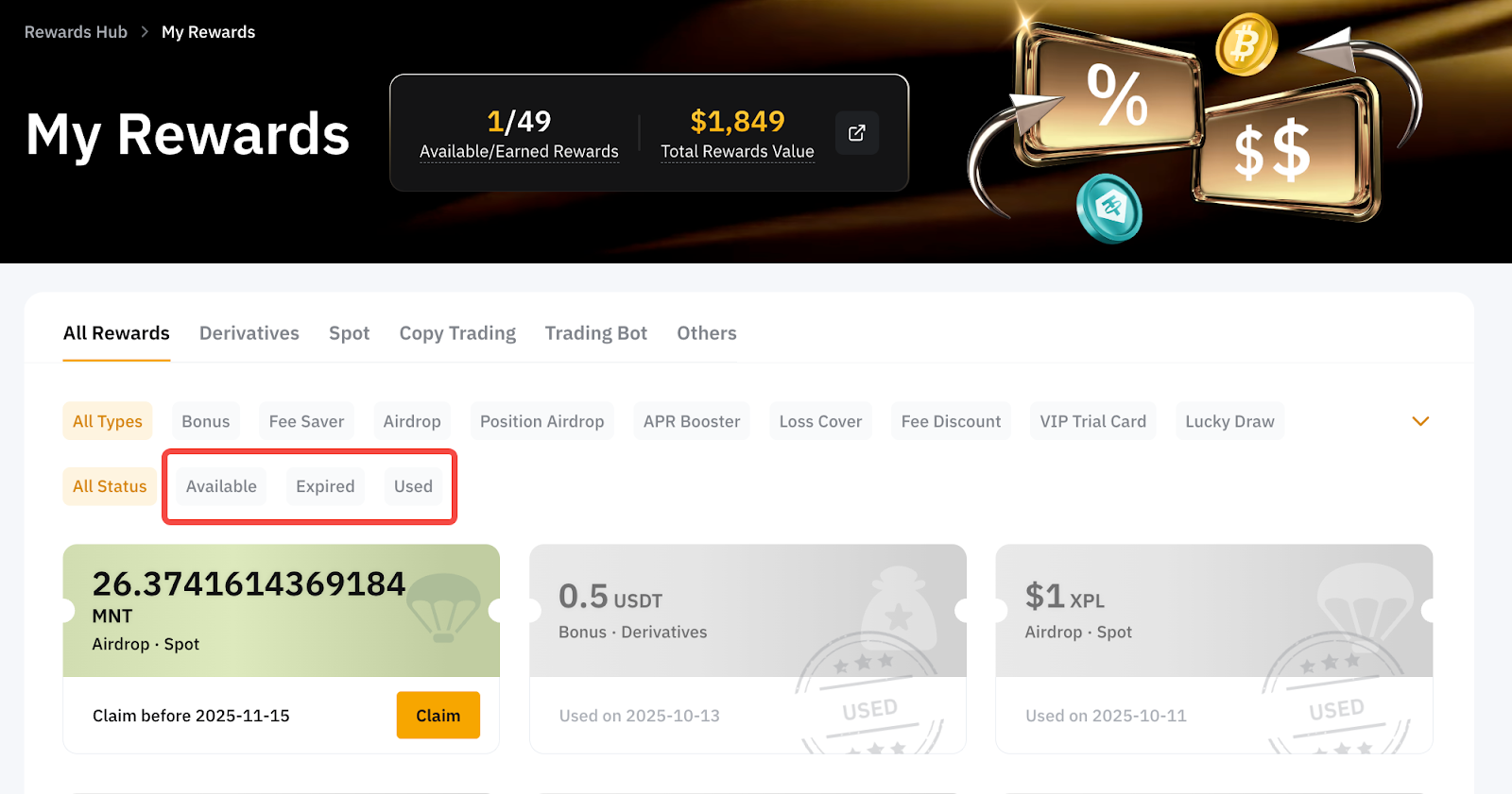 Used = Rewards claimed and used by the trader