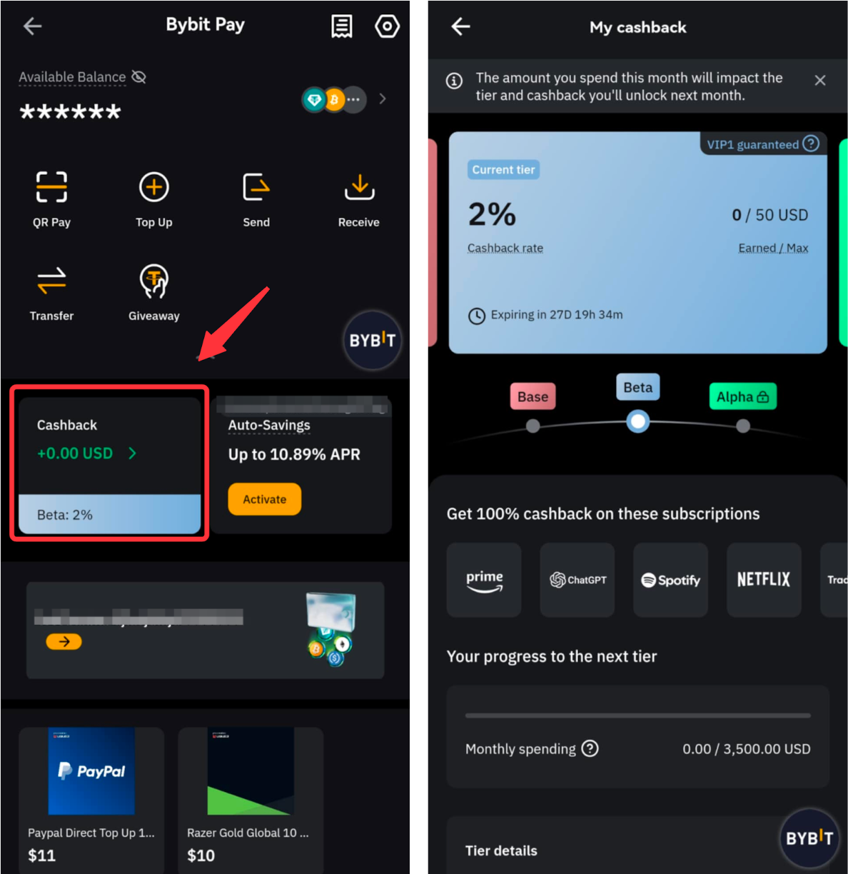 Your total monthly spend across Bybit Card and Pay is aggregated to determine your tier and cashback.
