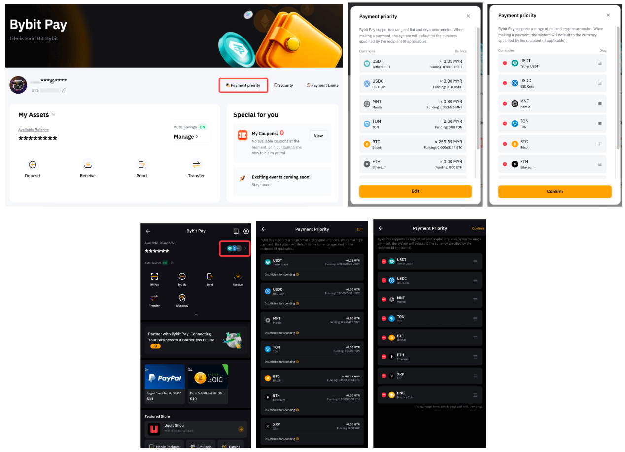 Go to Bybit Pay page → Payment Priority → Edit → Tap on the remove/add button, and drag to adjust the sequences.