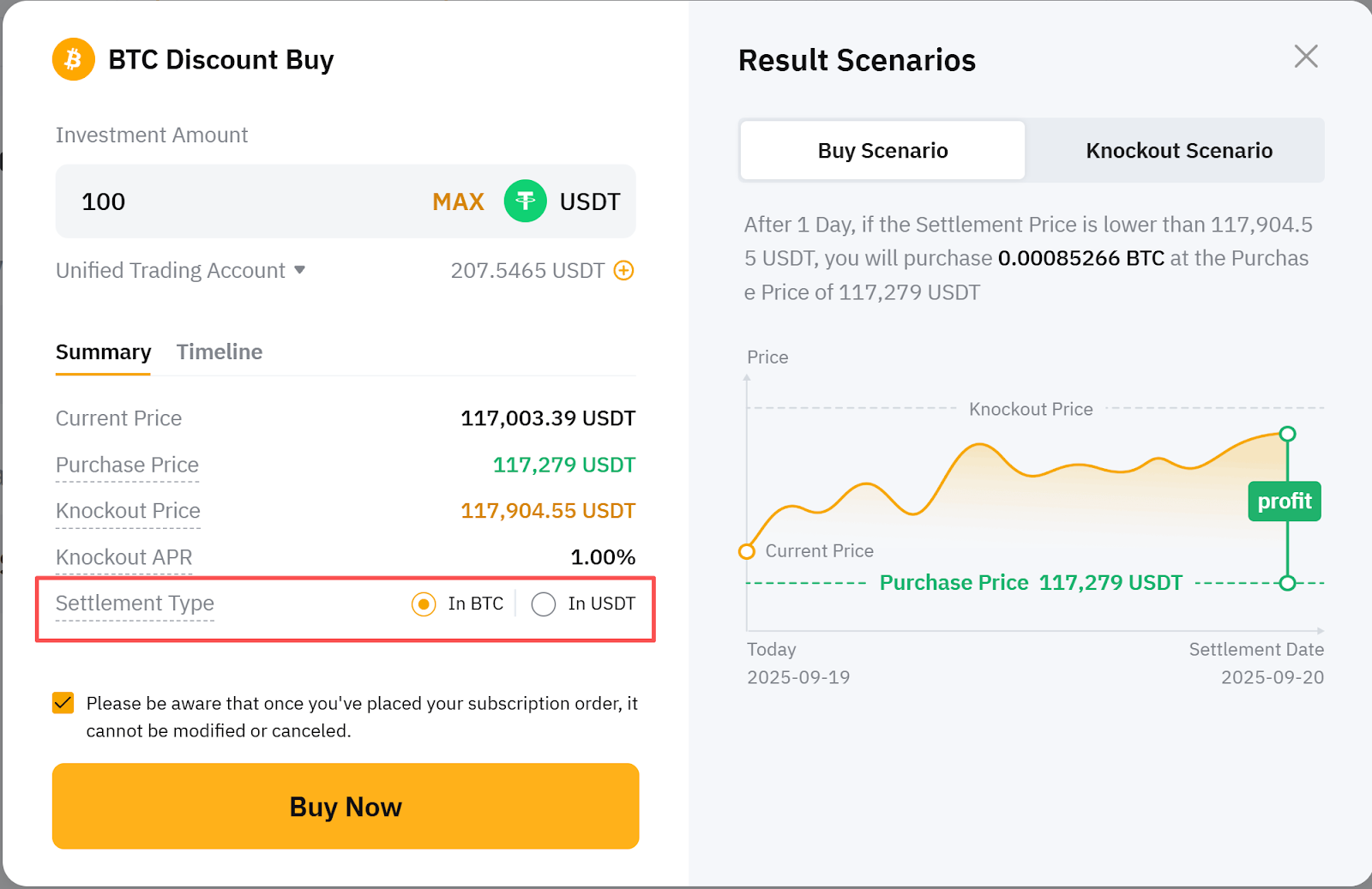 1. If the Settlement Price is below the Knockout Price, you will buy crypto at your preset discounted Purchase Price.