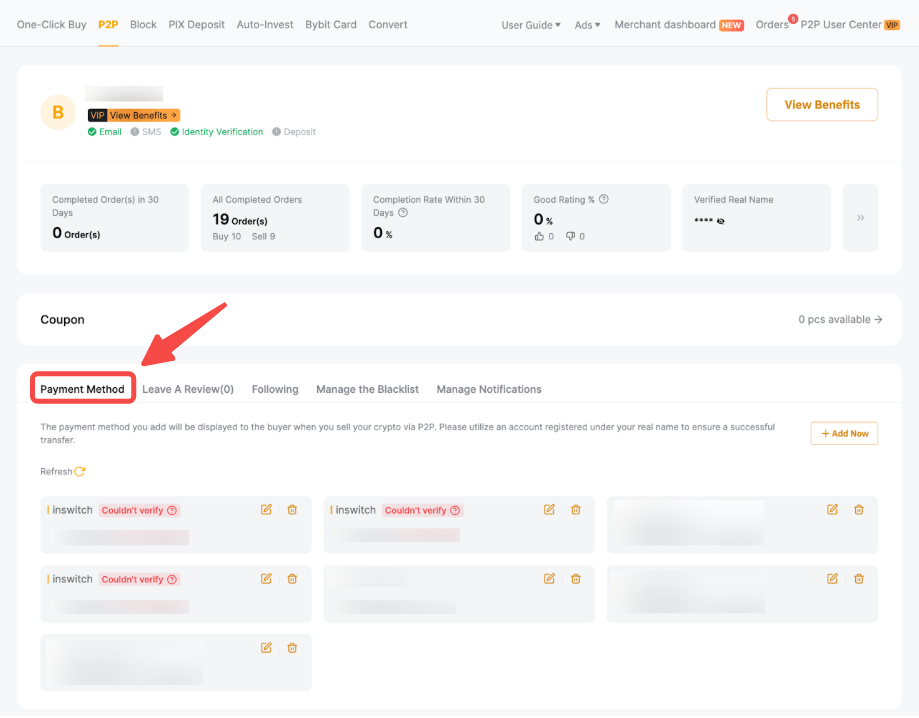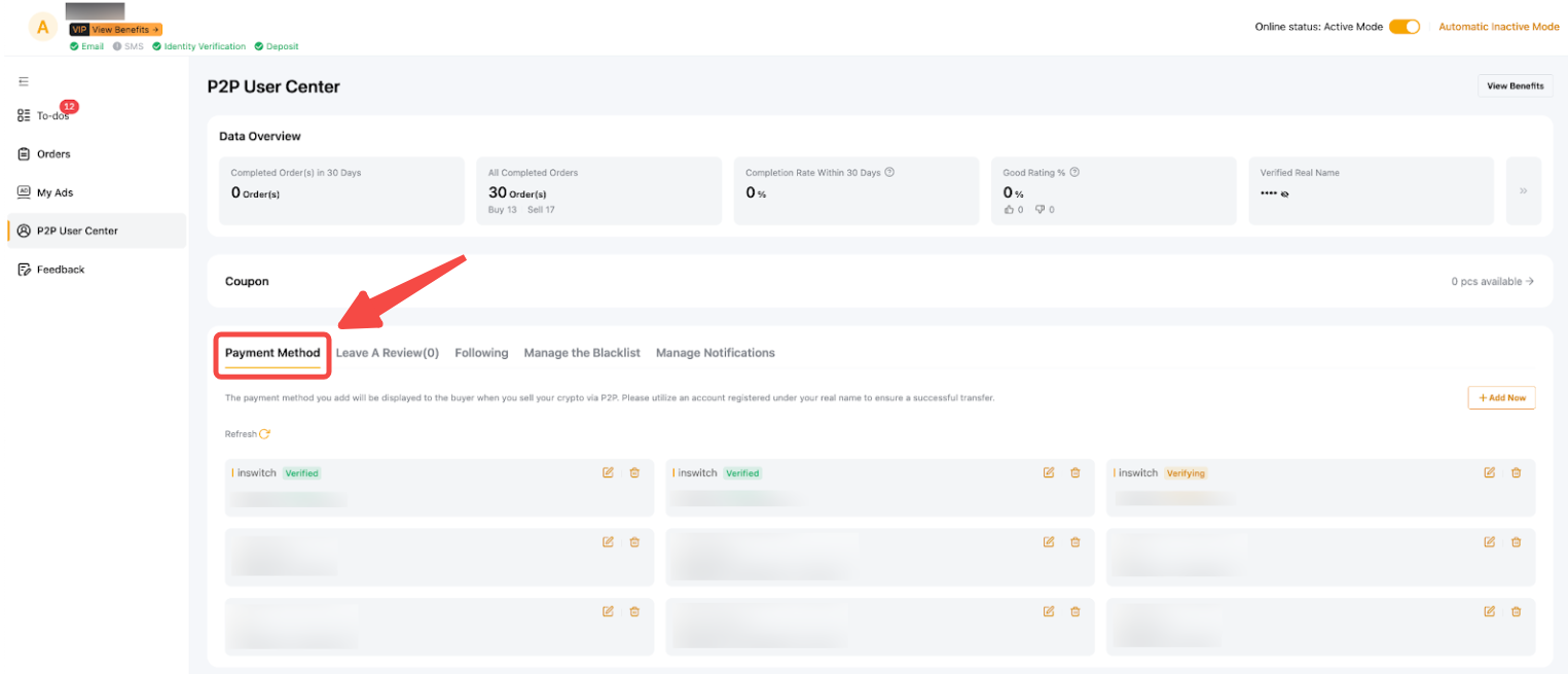 You can check the verification status on the payment methods page. To access this page, please go to P2P User CenterPayment Method.