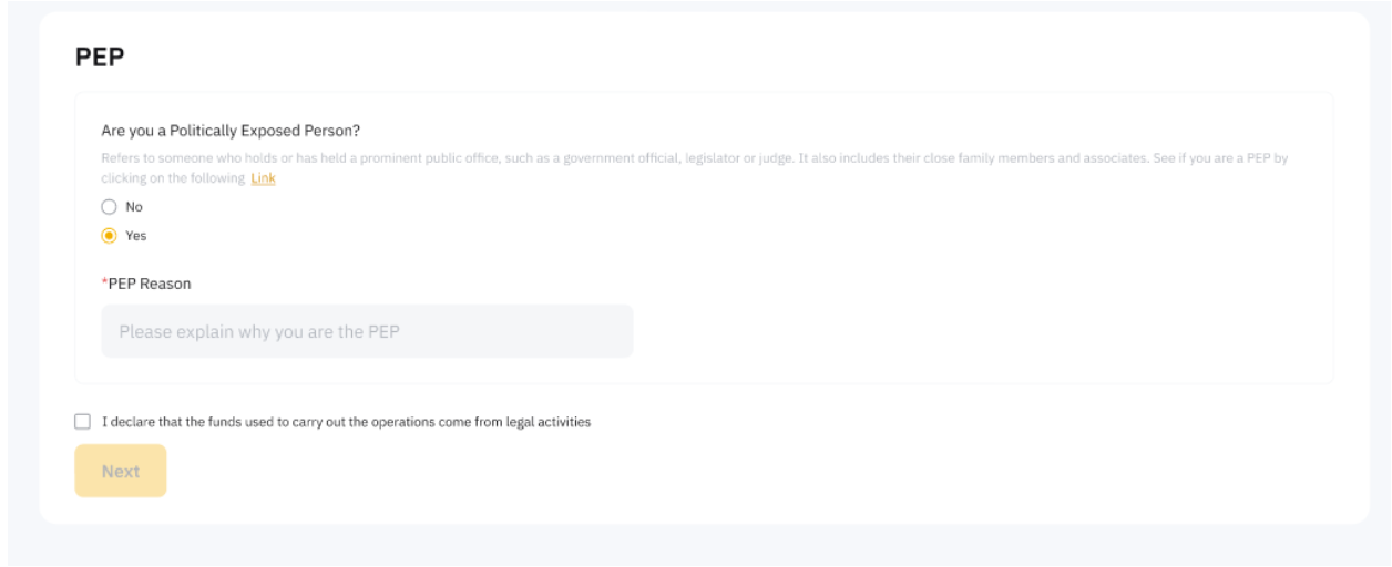 Step 4: Complete the PEP declaration and acknowledge that the funds used to carry out the operations come from legal activities.