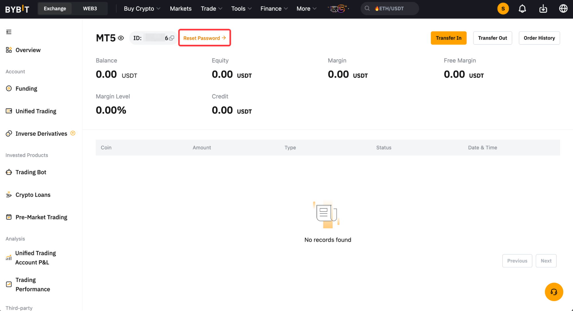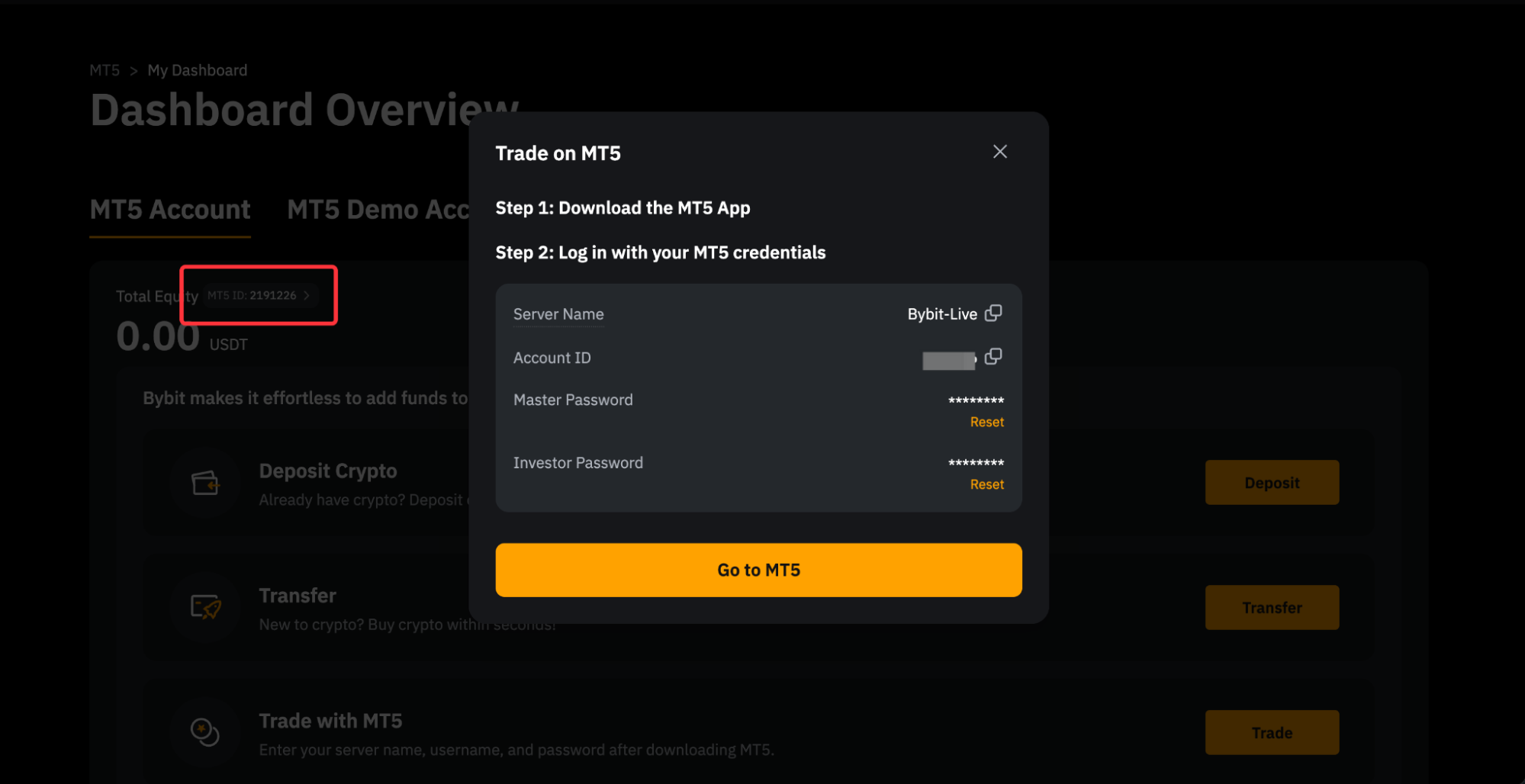 • Reset MT5 Read-Only Password: Investor Password that provides read-only access.