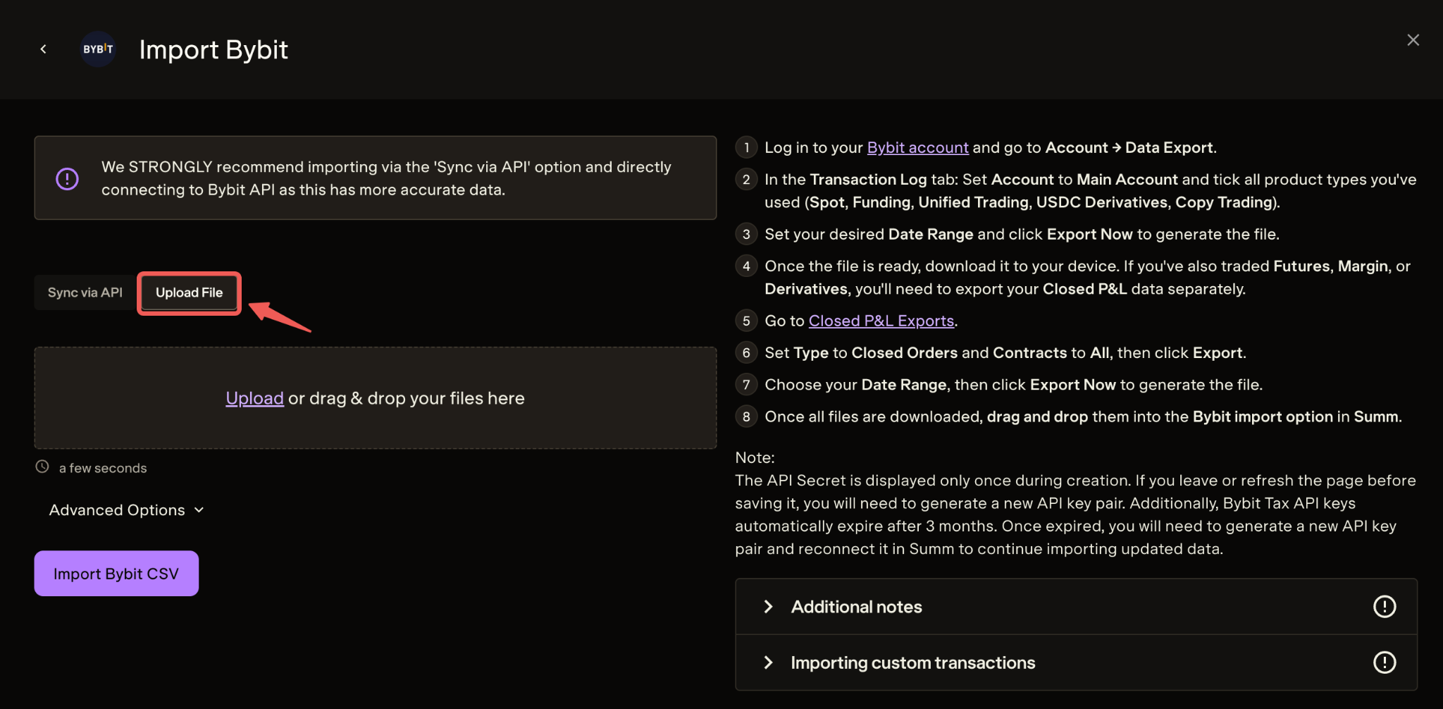 Once you have downloaded your Data Export File from Bybit, select the option Upload File in Summ and drag and drop your file(s) or click on the Upload button. Click Import Bybit CSV once done.
