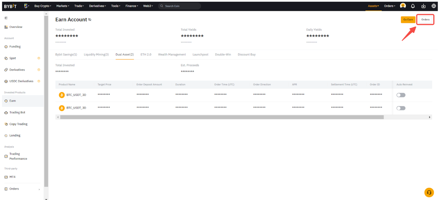 Alternatively, you can click on My Holdings at the top right of the Dual Asset page to enter the Dual Asset Orders page.