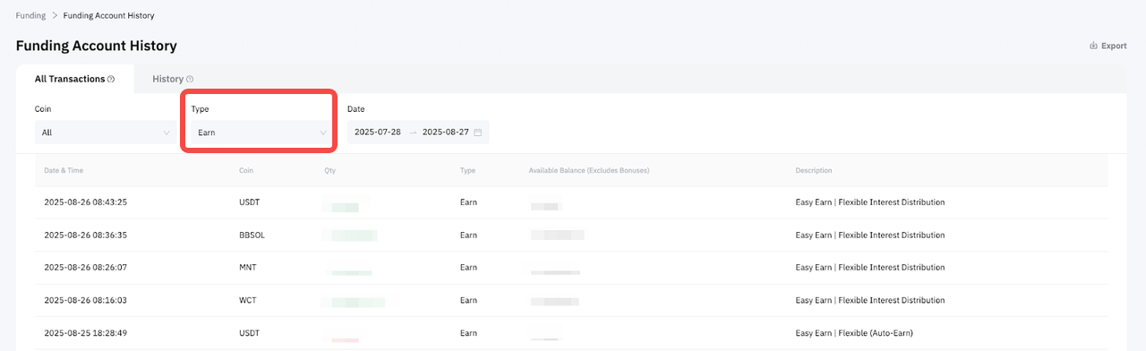 You can view your successful transactions in your Funding Account History under Earn.