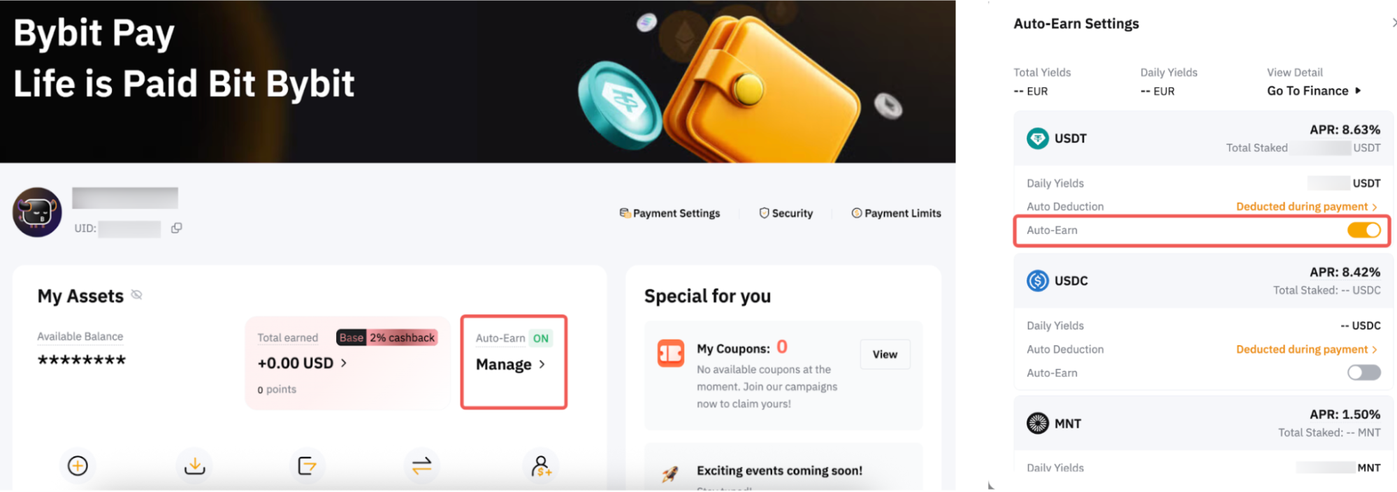 Step 2: On the Bybit Pay asset page, find the Auto-Earn switch button and toggle it on.
