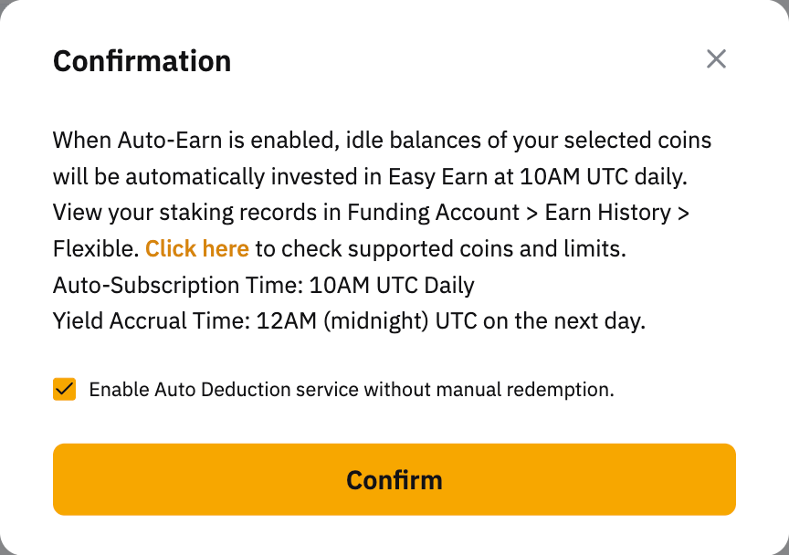 By enabling the Auto-Earn button, the transferable balance of your payment crypto asset (shown on each currency) in your Funding Account will be automatically subscribed to Flexible Term plans the next day.