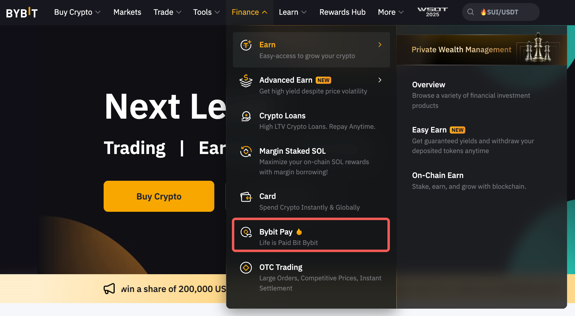 Step 1: Click on Finance in the upper left corner of the navigation bar on the Bybit page, then select Bybit Pay to enter the Bybit Pay page.