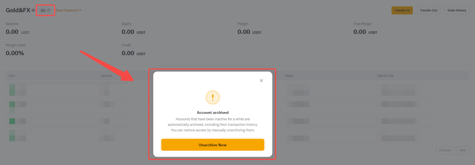 Go to your Bybit MT5 Asset Page. A pop-up message notifying you that your account is archived will appear. To unarchive the account, click on the Unarchive Now button
