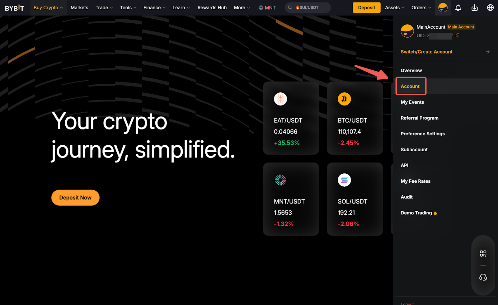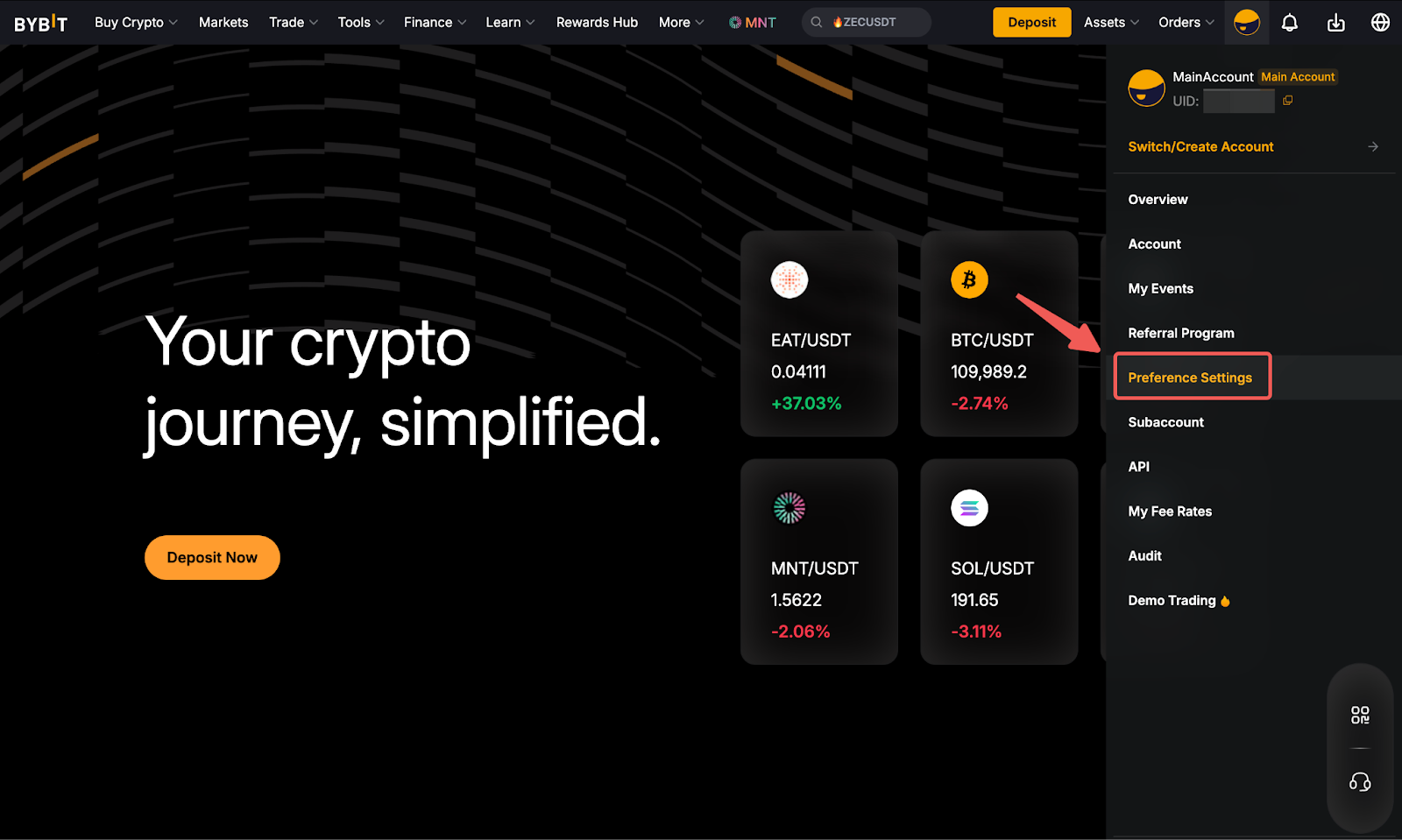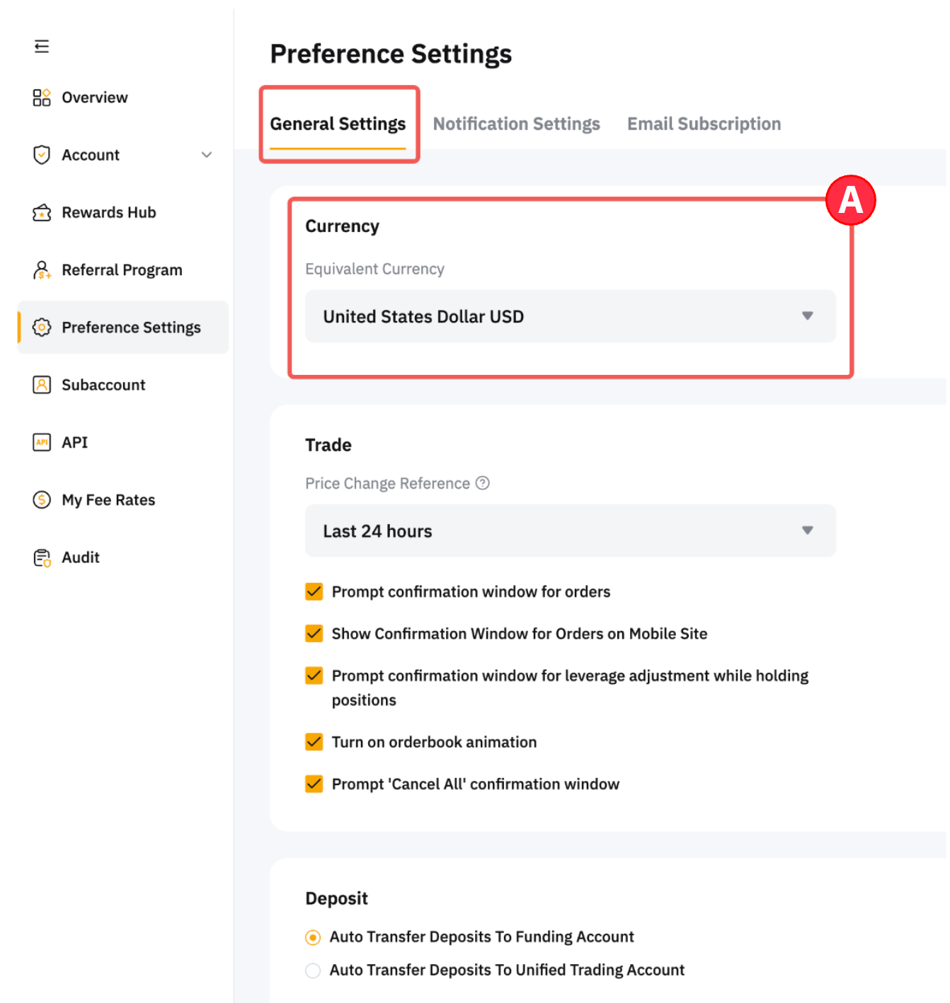 Select your preferred currency for display on the Bybit website in the General Settings tab. This currency will be used to give you an estimate of your funds and order amounts to better grasp the value in your account.