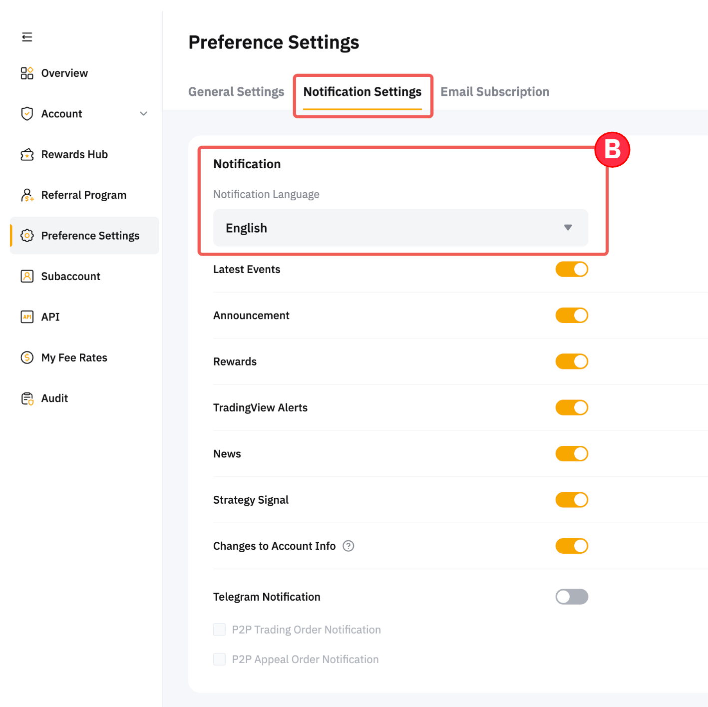 Select your preferred notification language inside the drop-down menu in the Notification Settings tab. Please note that this language setting only applies to the email notifications you receive. To modify the language of the website or pop-up notifications, please refer to this guide.