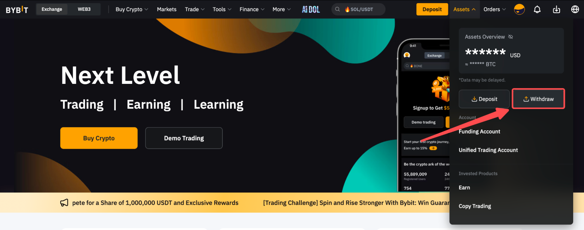 Step 1: Click on Assets at the top right-hand corner of the home page and go to Withdraw.