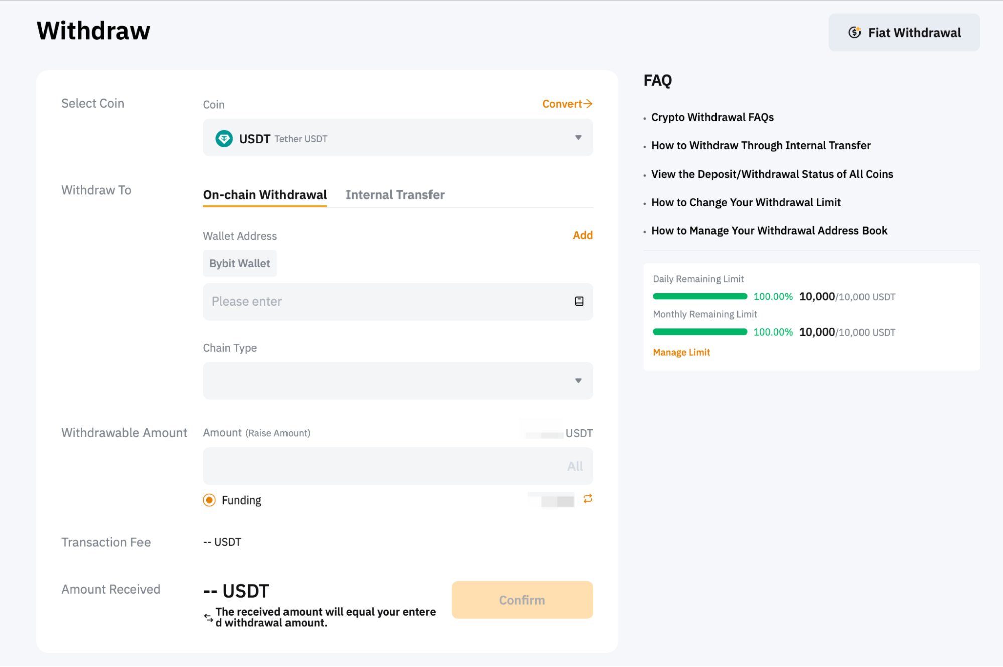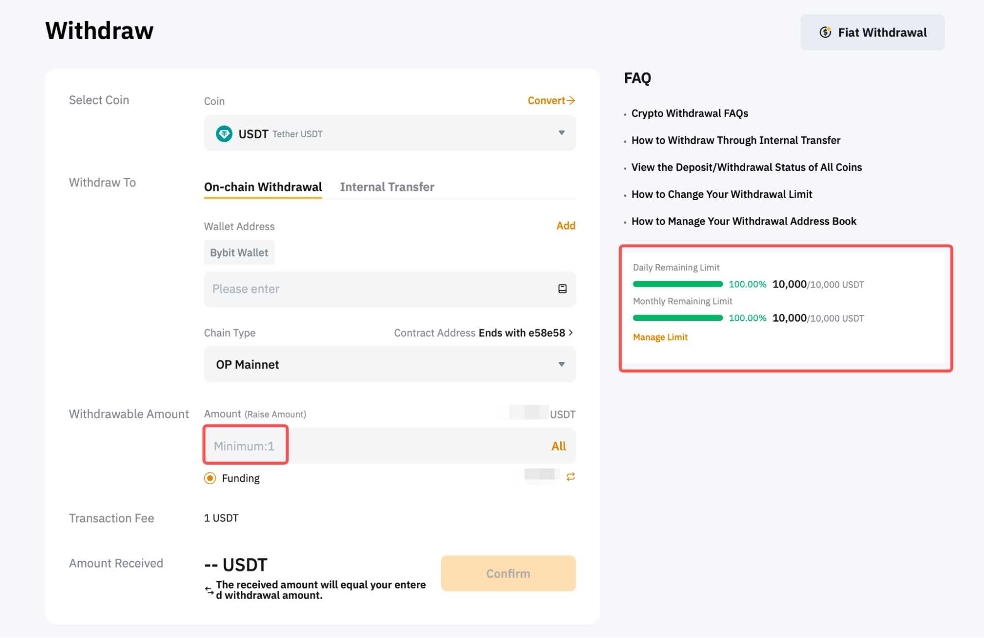 Step 4: Enter the amount you want to withdraw, or click on All to make a full withdrawal. Once the chain type is selected, the minimum withdrawal limit for this particular coin and blockchain network will be indicated in the withdrawable amount field. You’ll also find the daily and monthly remaining limits for withdrawal on the right side of the page. To change your withdrawal limit, follow the guide here.