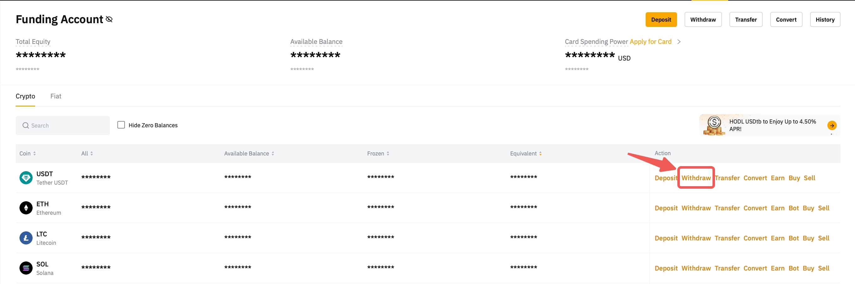 Alternatively, go to the Funding Account and click on the Withdraw button in the column of the coin you would like to withdraw.