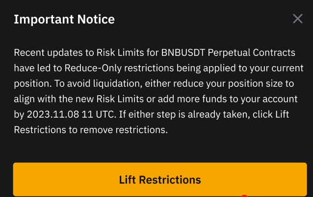 If the system deems that the post-adjustment risk is higher, the new risk parameters will fail to apply to your account immediately. In this case, a 10-day buffer period will be given, during which you will only be allowed to place orders with a Reduce-only nature or cancel orders for the specific trading pair in question. You won’t be able to place new markets or limit orders that would increase your position size (conditional orders remain unaffected) until you add more margin to your account or position to accommodate the new risk limit tier. Any existing orders will be retained.
