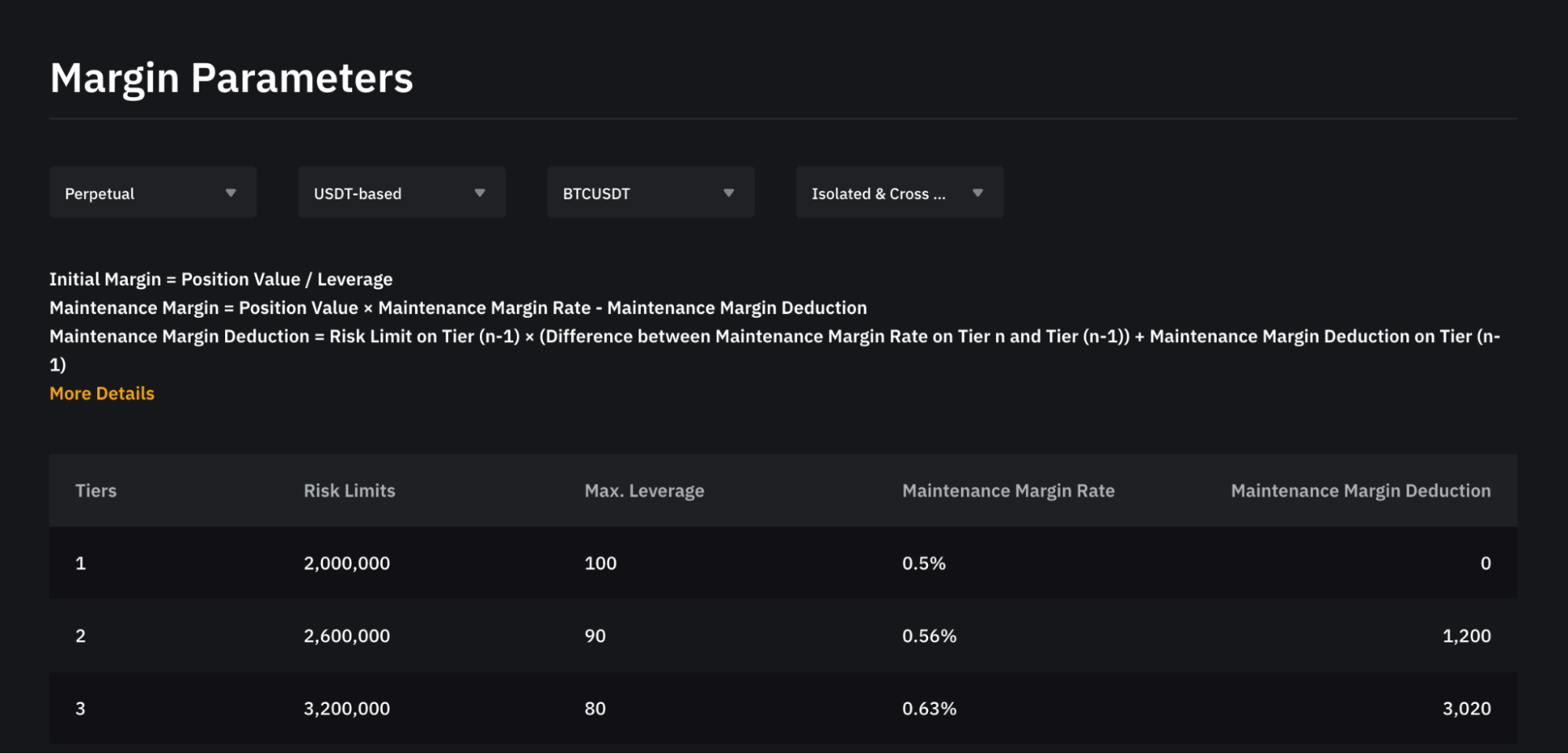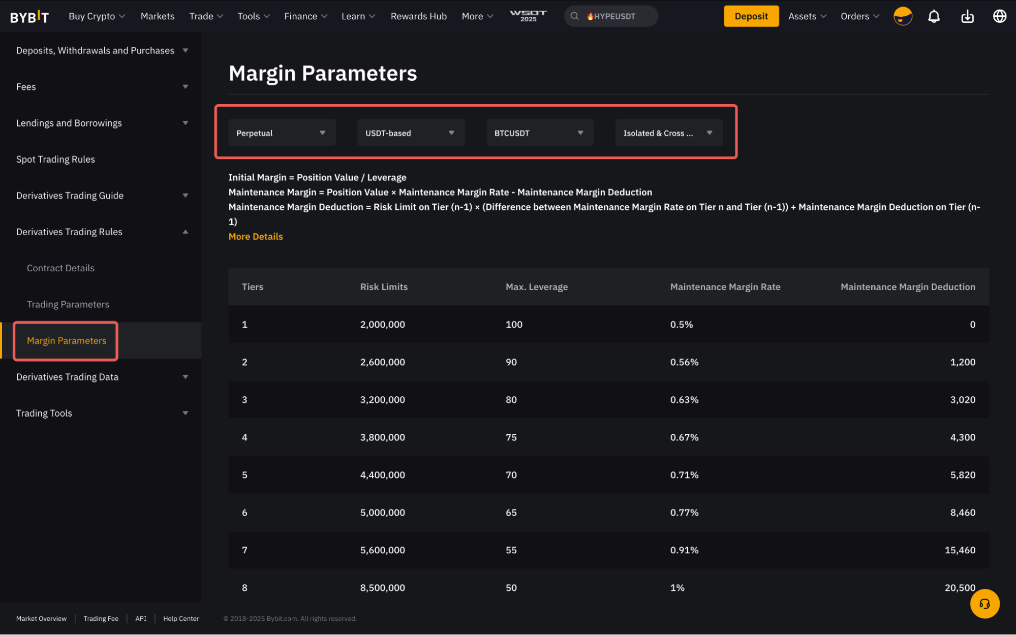 To view the Risk Limit information for all trading pairs, you can click on the Derivatives Info → Derivatives Trading Rules → Margin Data or visit this page.