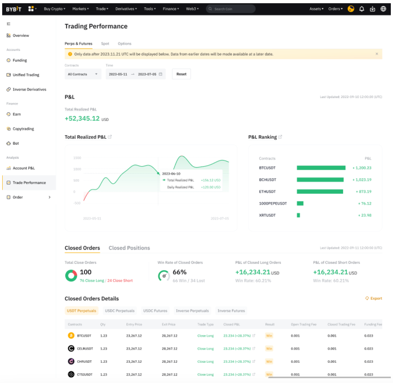 As of now, trading performance data for Spot, Perpetual, Futures and Options contracts is available.